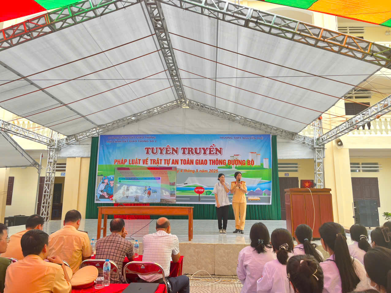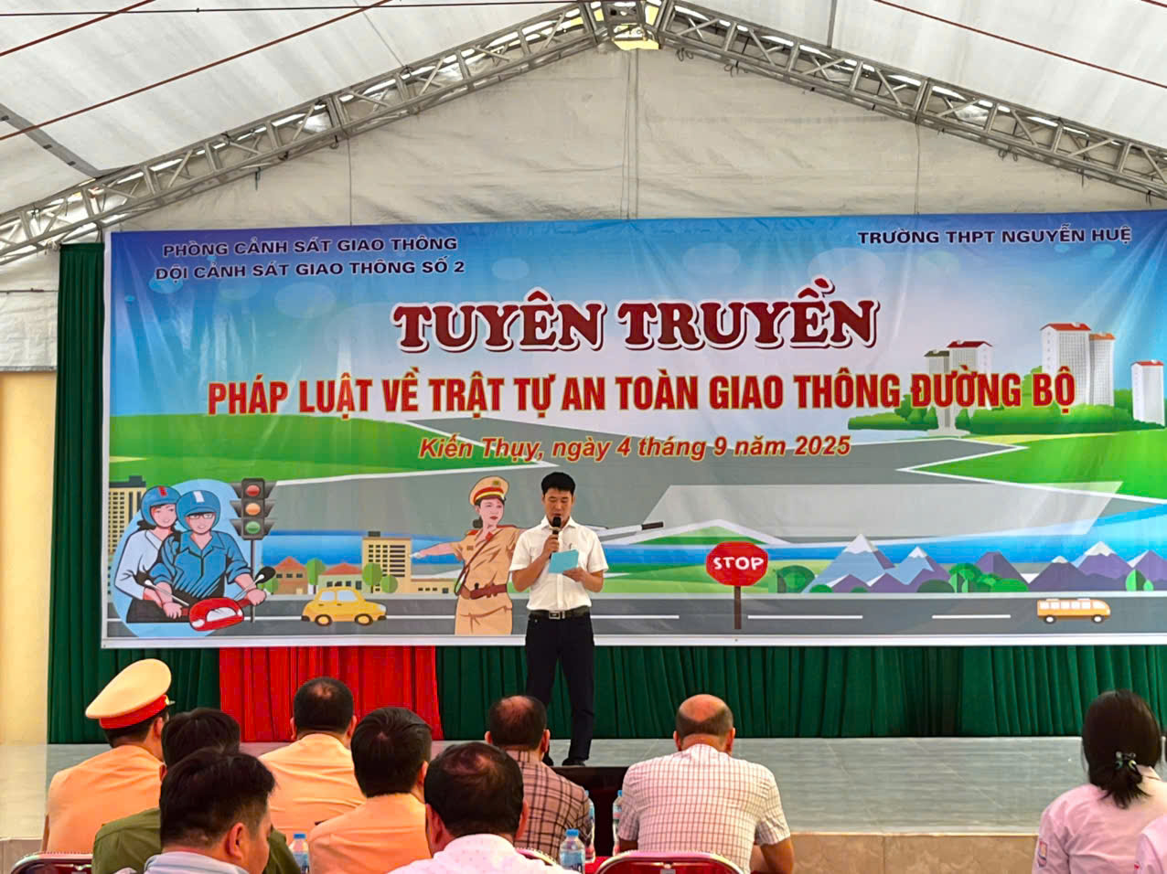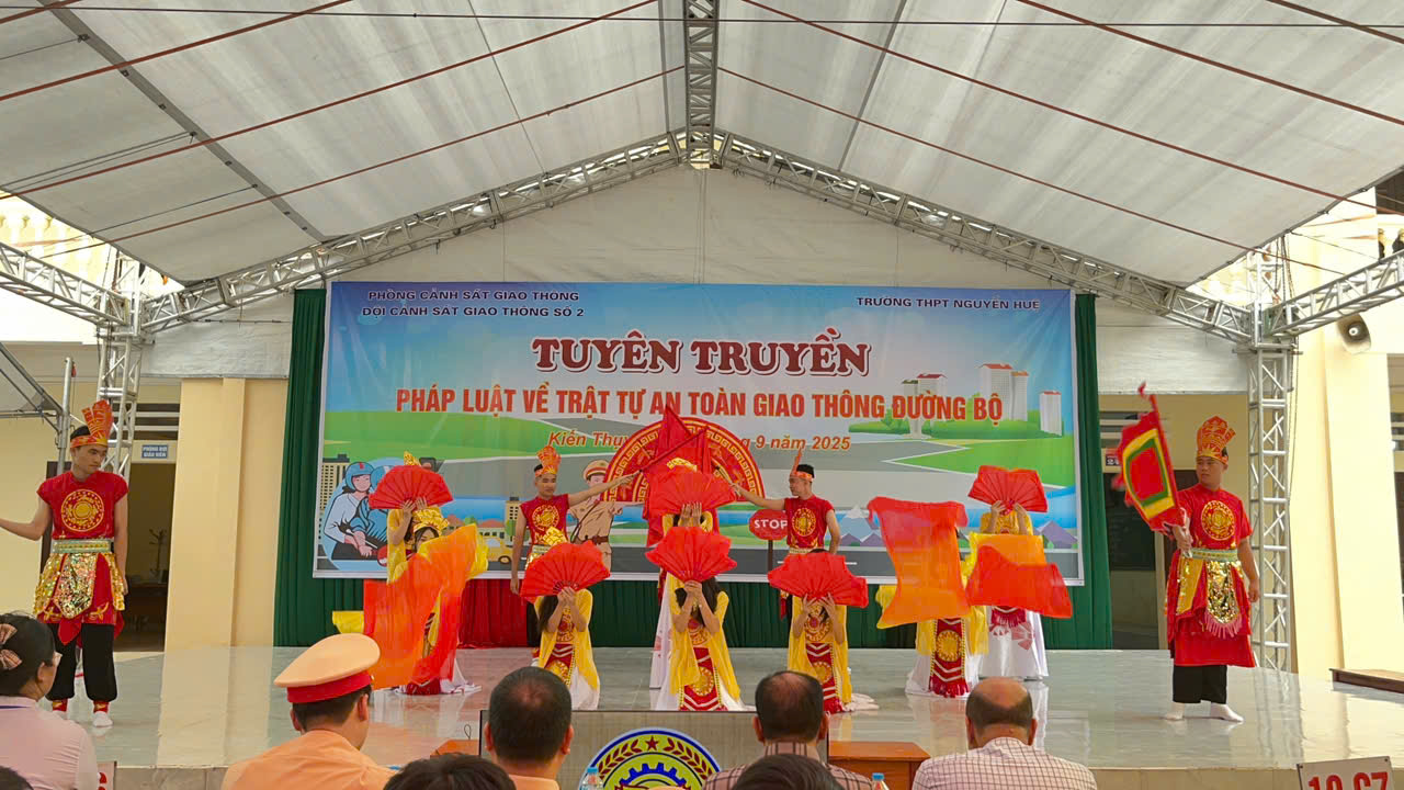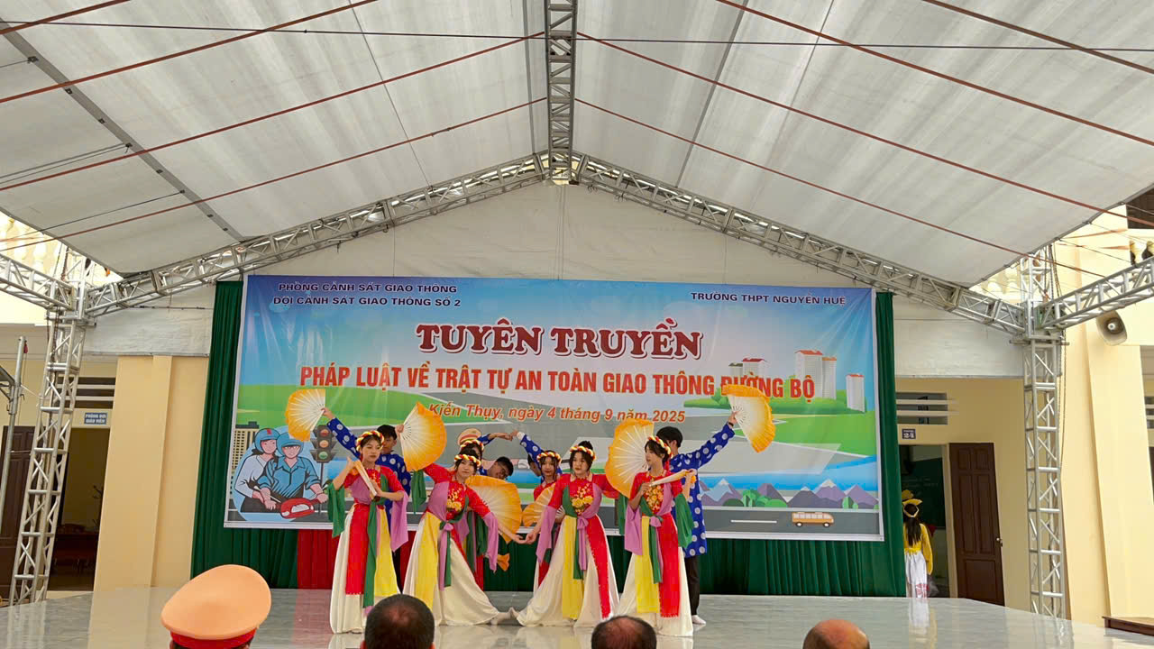 Sáng ngày 4/9/2025 Trường THPT Nguyễn Huệ phối hợp cùng Phòng cảnh sát giao thông - Đội cảnh sát giao thông số 2 tổ chức hoạt động Tuyên truyền pháp luật về trật tự an toàn giao thông đường bộ.