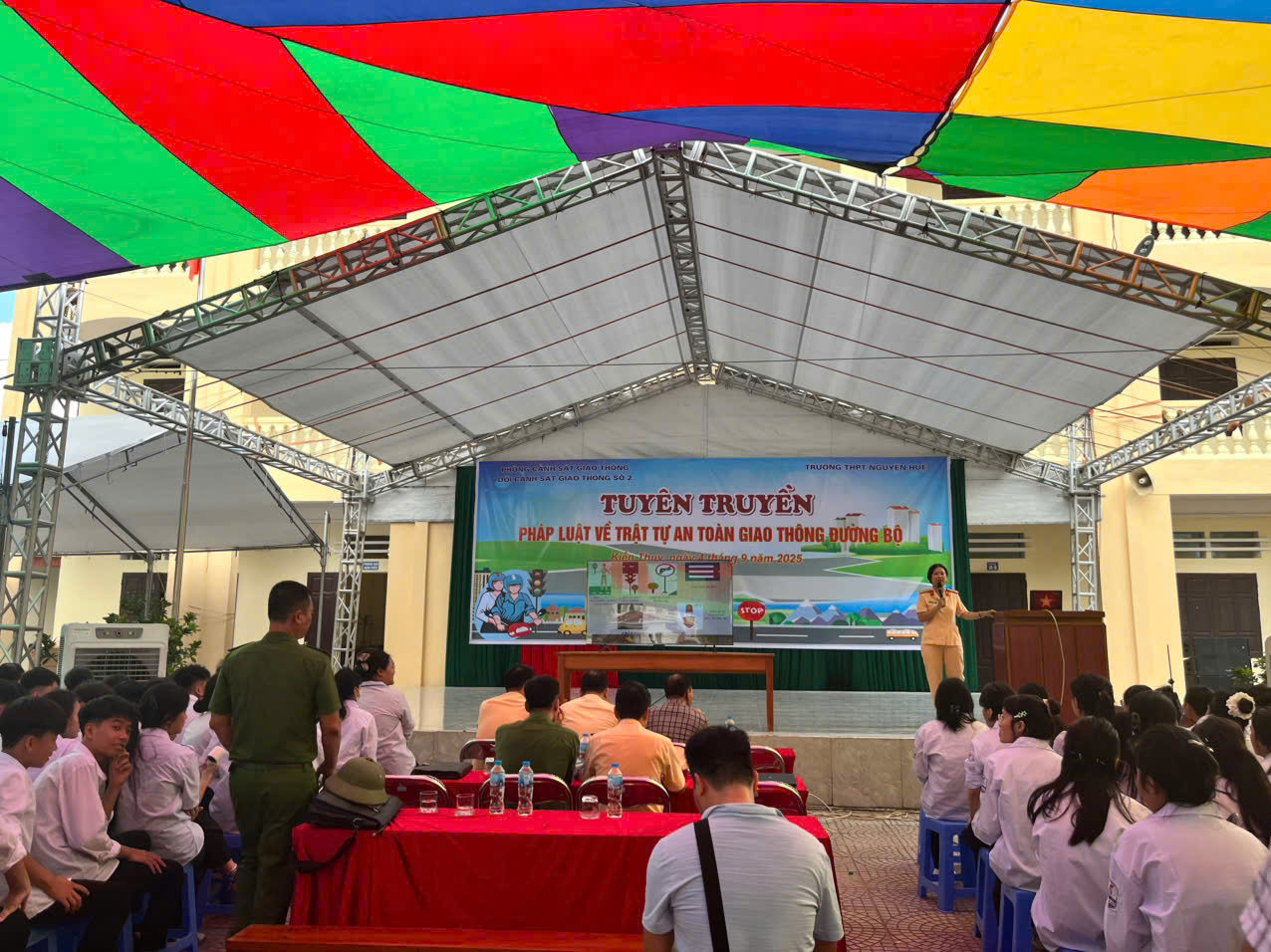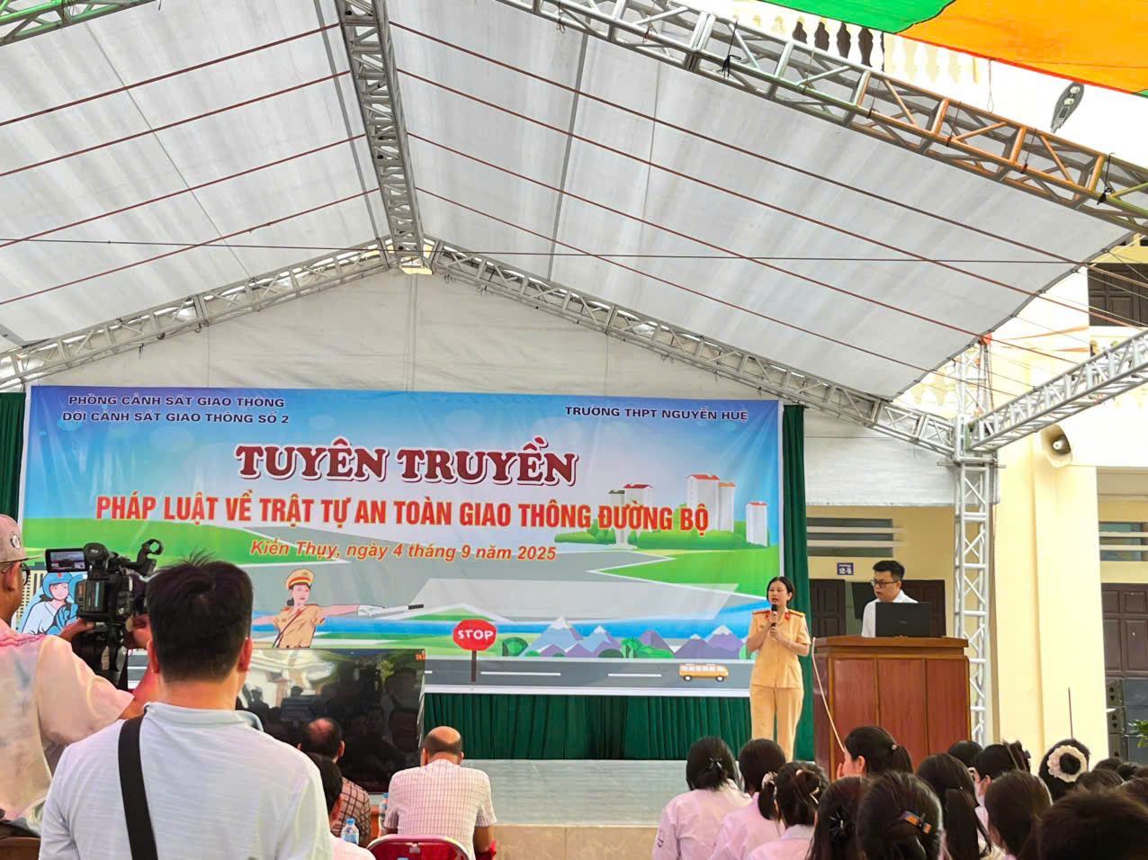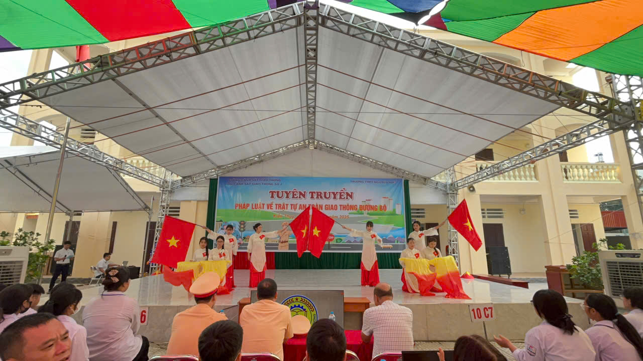 Sáng ngày 4/9/2025 Trường THPT Nguyễn Huệ phối hợp cùng Phòng cảnh sát giao thông - Đội cảnh sát giao thông số 2 tổ chức hoạt động Tuyên truyền pháp luật về trật tự an toàn giao thông đường bộ.